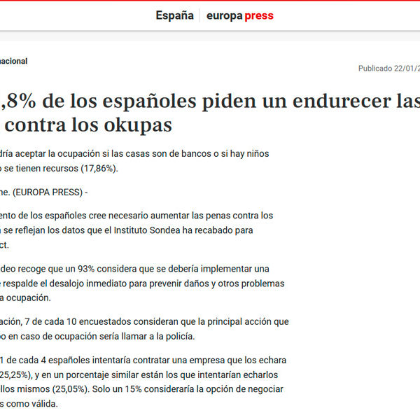Un 92,8% de los españoles endurecería las penas contra los okupas, según un sondeo