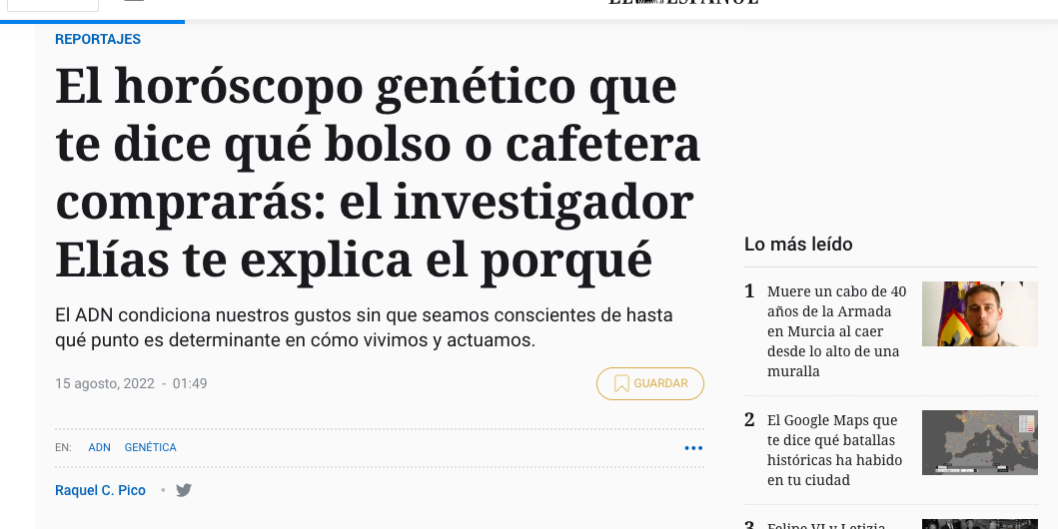 El horóscopo genético que te dice qué bolso o cafetera comprarás: el investigador Elías te explica el porqué Categoría: medios-espPor Francesca Loprieno20 septiembre, 2022Deja un comentarioNavegación entre proyectosAnteriorProyecto anteriorLaVanguardiaSiguienteProyecto siguienteGastroActitud