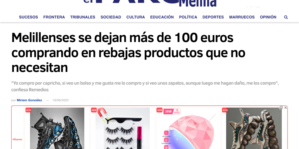 Melillenses se dejan más de 100 euros comprando en rebajas productos que no necesitan Categoría: medios-espPor Francesca Loprieno20 septiembre, 2022Deja un comentarioNavegación entre proyectosAnteriorProyecto anteriorAtlasAgenciaSiguienteProyecto siguienteLaVanguardia